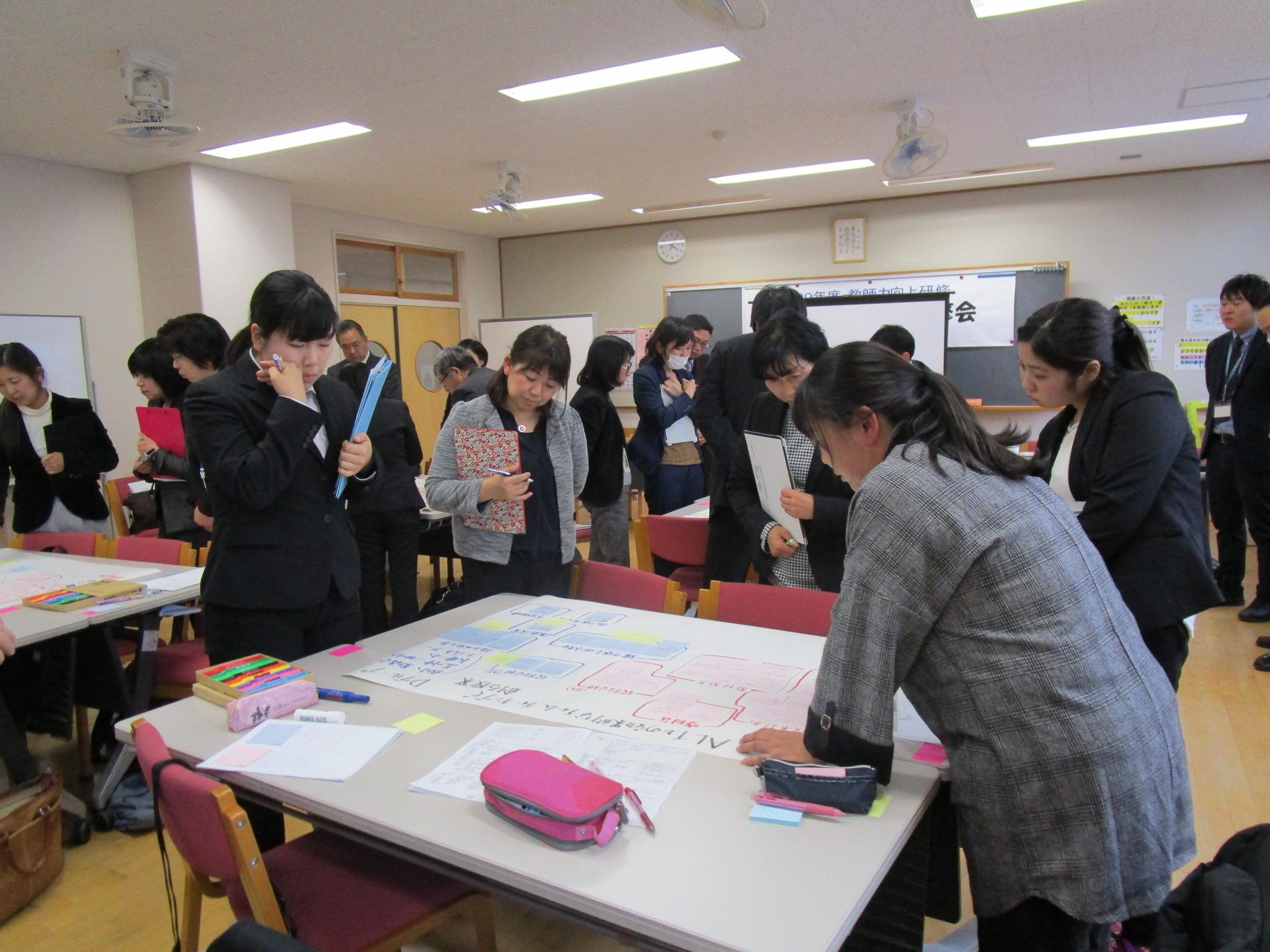 ワークショップ形式のグループワークで、授業の良かった点、課題点を出しないながら、よりよい指導方法についてのアイディアを出し合いました。参加した先生たちからはよりよい指導方法について積極的に意見が出され、話し合いが深まりました。その後ポスターセッション方式で各グループで話し合われた意見のアイディアを共有しました。